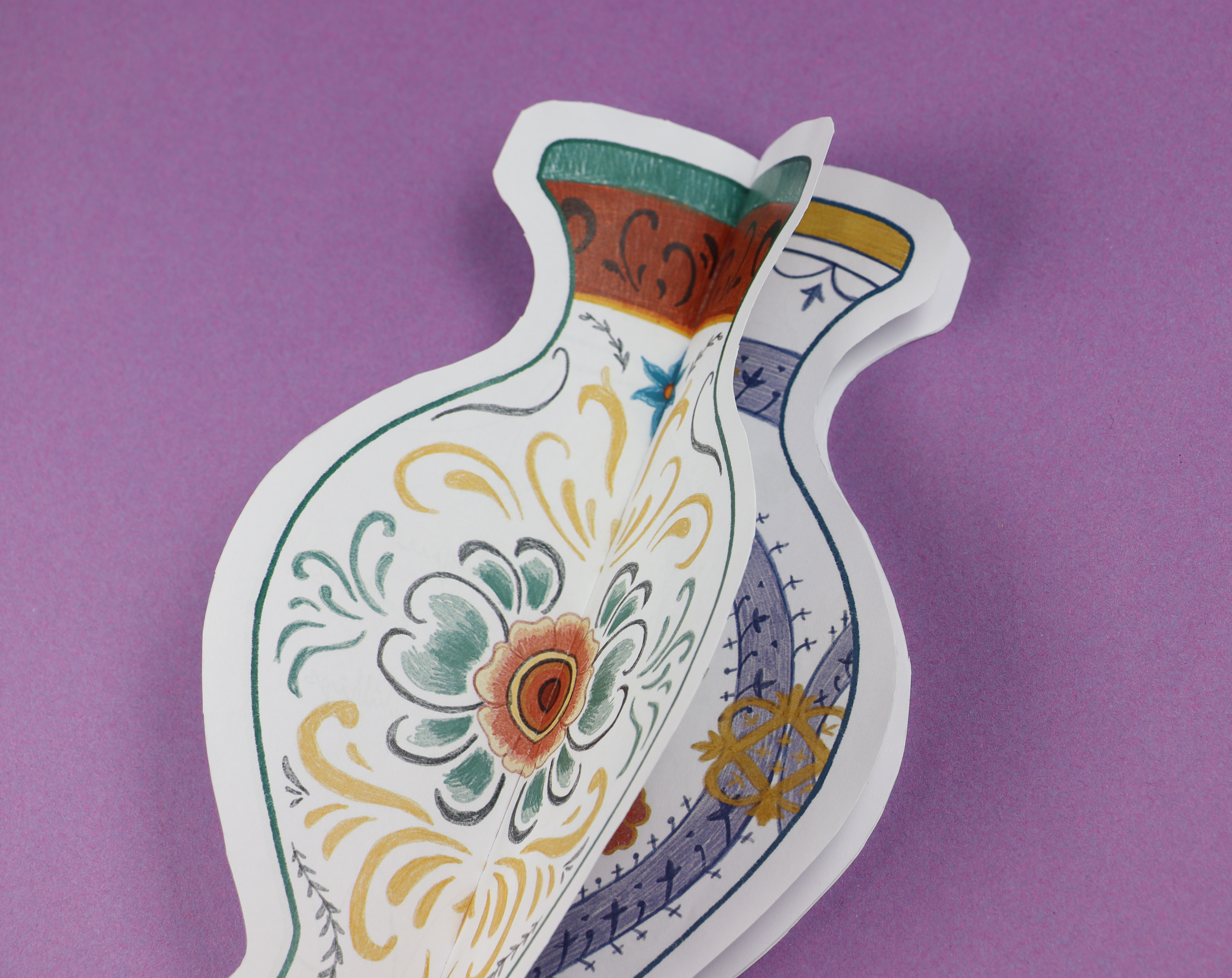 As someone who has always loved detail and patterning, I created this piece to honour the history of ornate patterning, in today's predominantly minimalistic world. Each design is either one I have found in person when visiting antique shops and markets, or one which is inspired by an object from my life and childhood. The booklet is shaped as a vase and features five different designs.