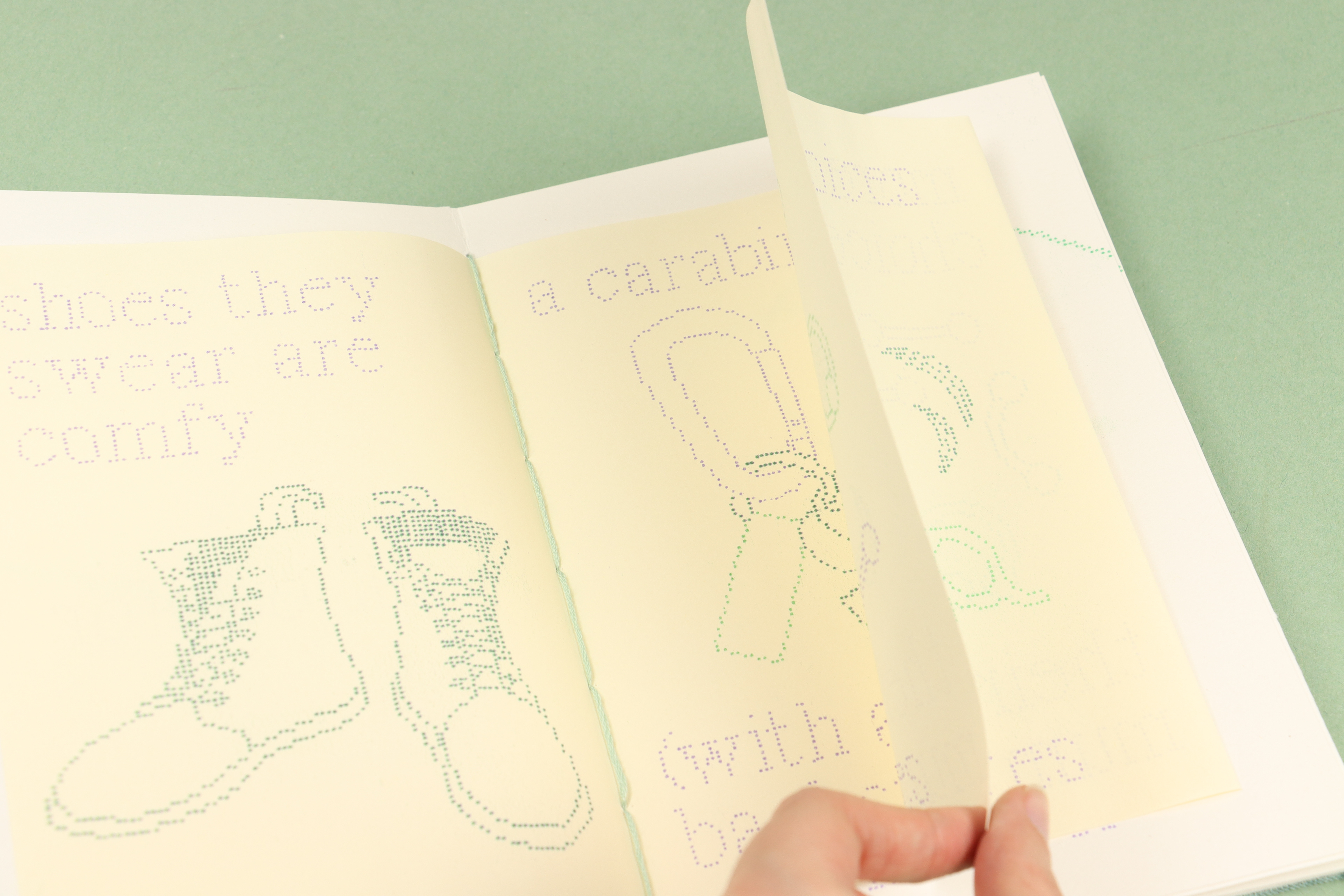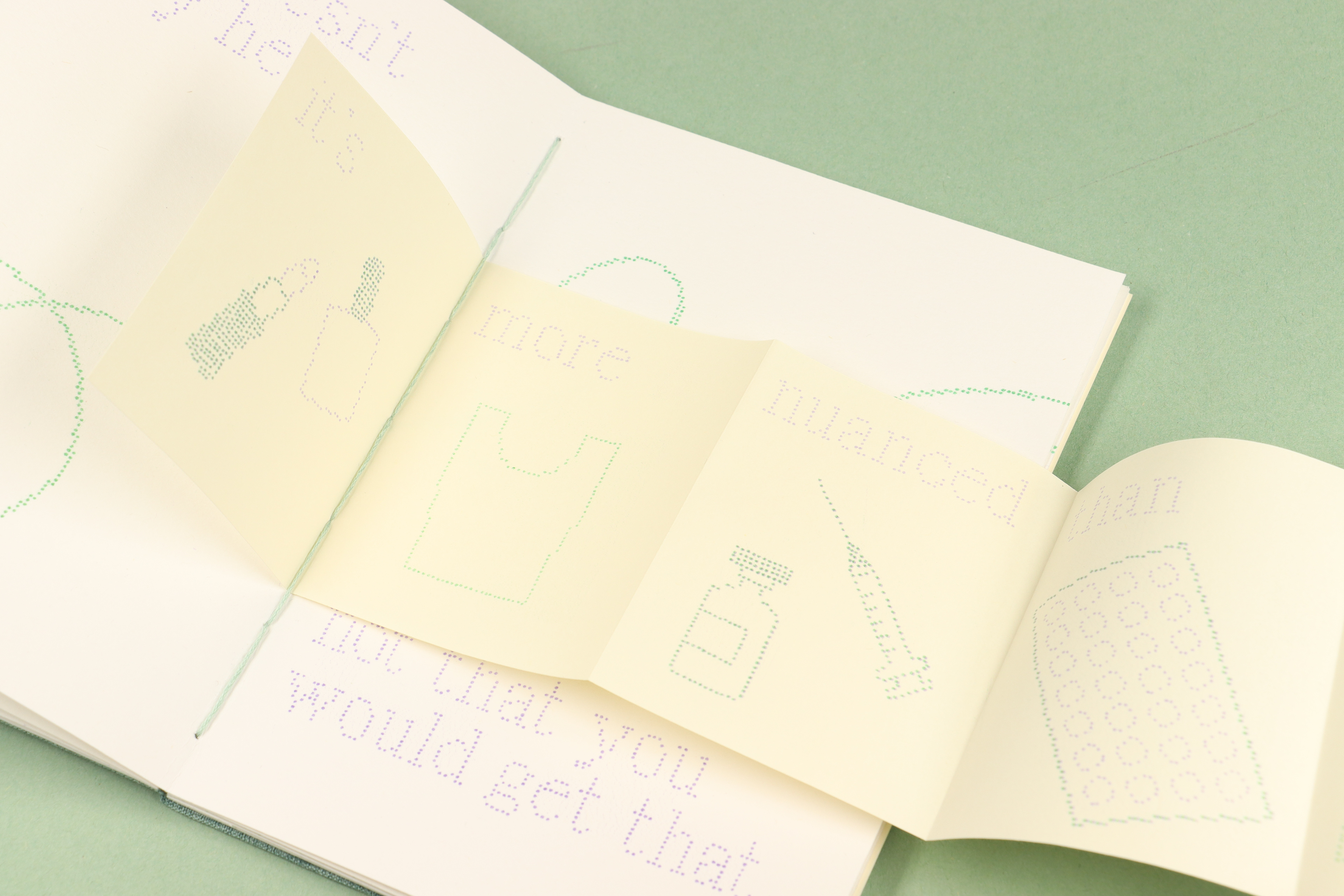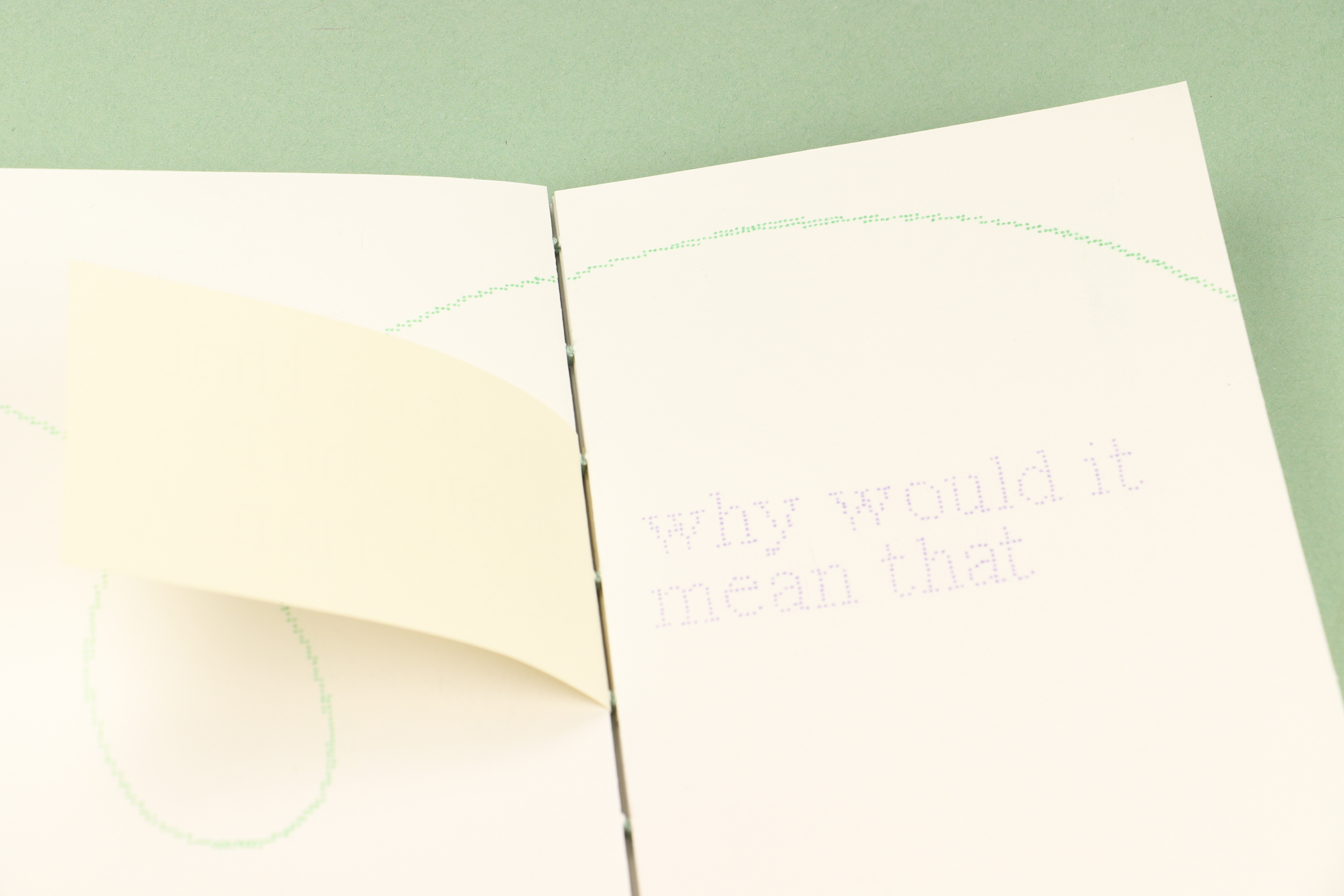 Each page in this book, and the imagery and text upon them, is comprised of hundreds of hand drawn dots. These dots were then scanned, recoloured and riso printed. This process was meditative, allowing me to work through my frustrations towards this collection of too-often asked and occasionally irritating questions. The book itself was also hand bound using coptic stitching, another relaxing process.