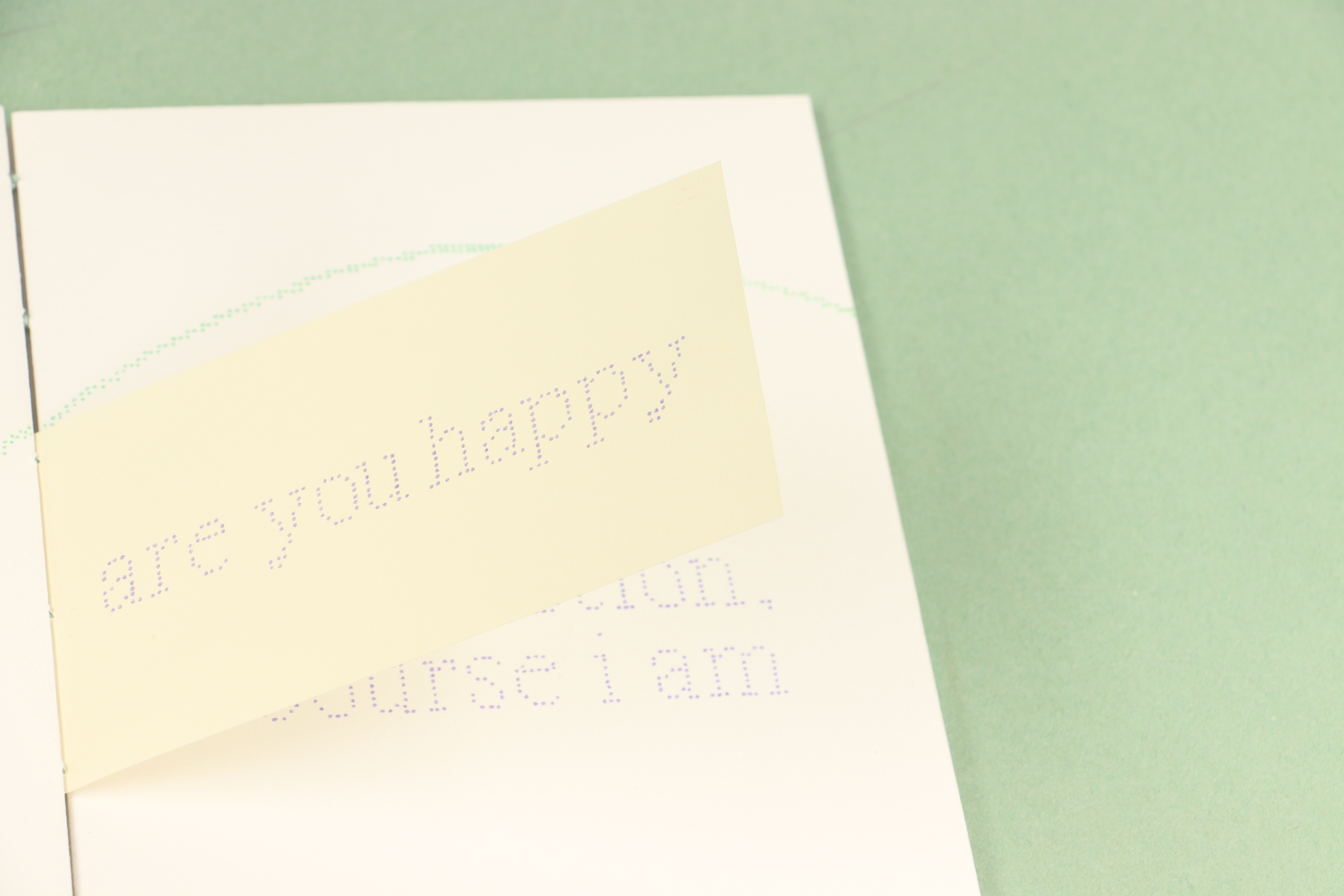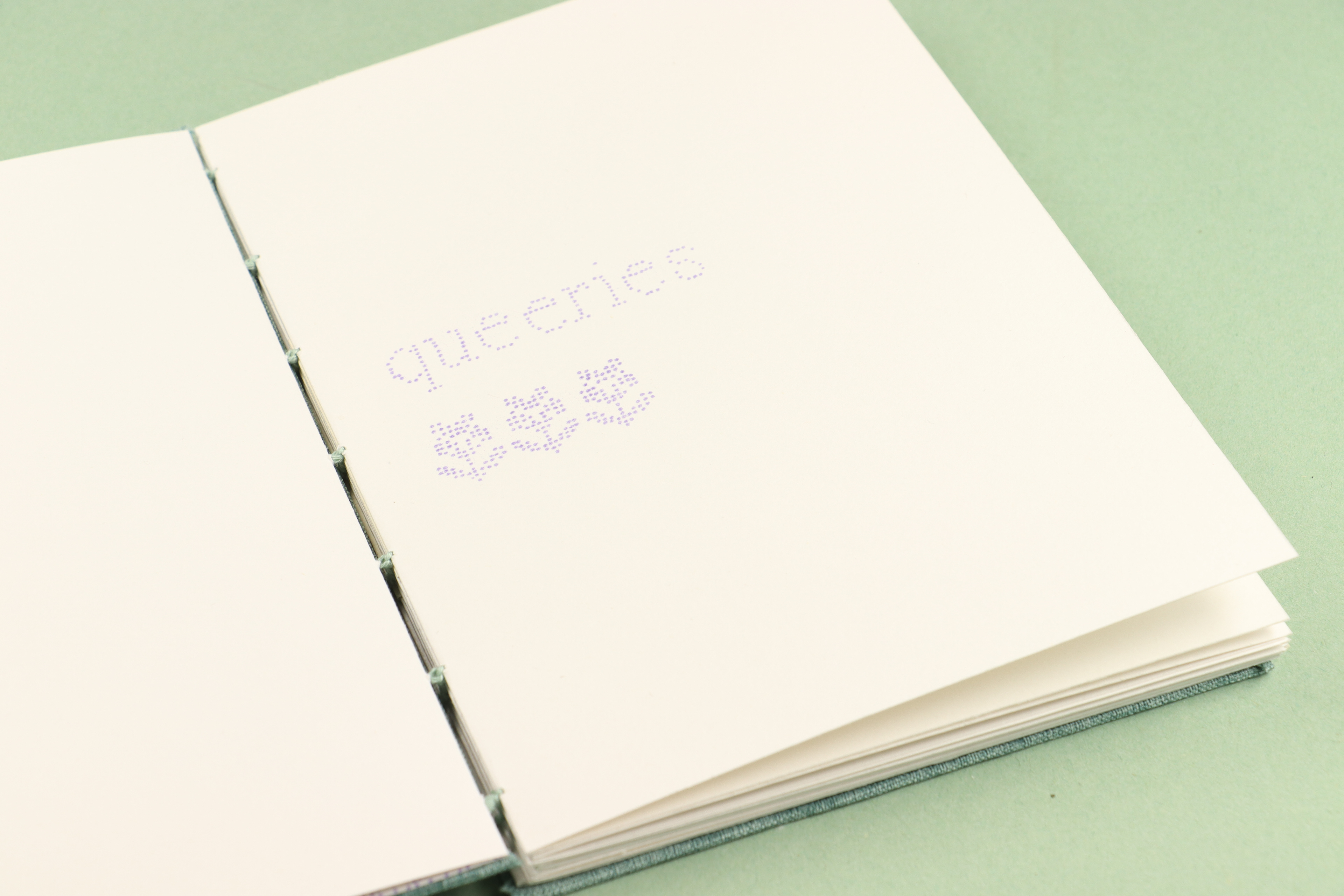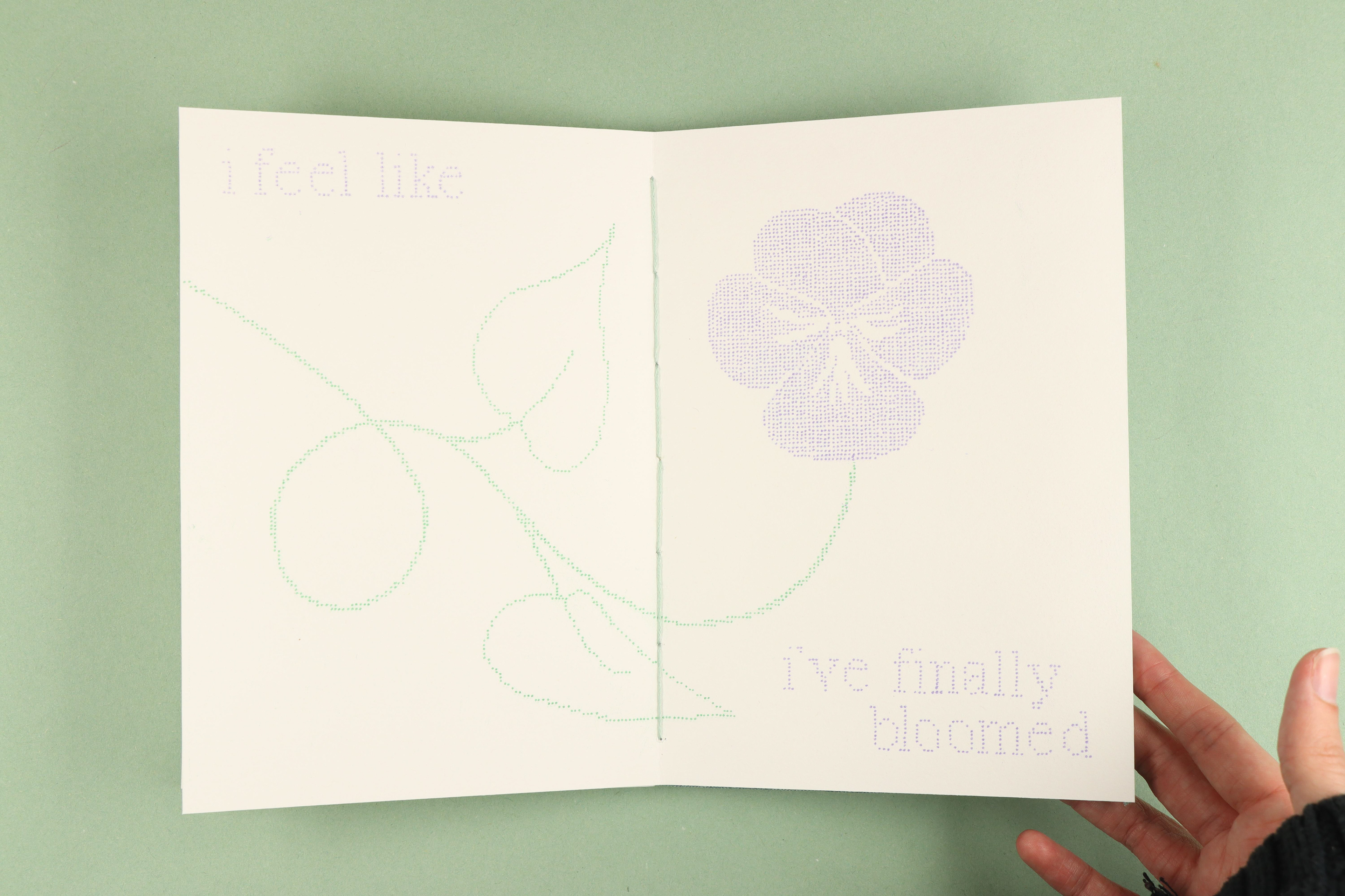 Each page in this book, and the imagery and text upon them, is comprised of hundreds of hand drawn dots. These dots were then scanned, recoloured and riso printed. This process was meditative, allowing me to work through my frustrations towards this collection of too-often asked and occasionally irritating questions. The book itself was also hand bound using coptic stitching, another relaxing process.